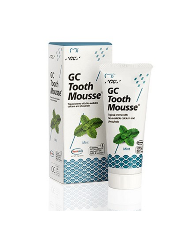 De GC Tooth Mousse Mint is een speciale crème op basis van Recaldent (CPP-ACP). Deze stof bestaat uit calcium en fosfaat. Dit zijn natuurlijke bouwstenen van tanden. De mousse dringt door tot in het tandglazuur en hecht zich aan het tandoppervlak. Hierdoor ontstaat er als het ware een vloeibare beschermlaag. Deze laag ondersteunt het natuurlijke herstel van het glazuur en helpt de tanden sterker te maken. Vooral bij gevoeligheid of na intensieve behandelingen is dit een groot voordeel.