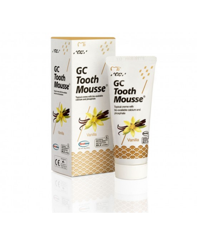 GC Tooth Mousse is een crème op waterbasis die u plaatselijk aanbrengt op uw tanden. De formule bevat Recaldent (CPP-ACP), afkomstig uit melkeiwit caseïne. Dit bestanddeel bindt calcium en fosfaat en brengt deze mineralen naar het tandoppervlak.