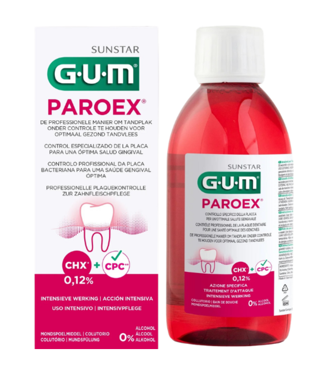 GUM Paroex is een GUM mondspoeling die wordt ingezet bij tandvleesklachten en na tandheelkundige behandelingen. Denk aan situaties zoals het trekken van een kies, het plaatsen van een implantaat of een tandvleesbehandeling. Dit GUM mondwater bevat 0,12% chloorhexidine en CPC. Deze combinatie helpt tandplak verminderen en ondersteunt het gezond houden van het tandvlees. Deze mondspoeling tandvlees is bedoeld voor tijdelijk gebruik wanneer normaal poetsen alleen niet voldoende is. Zo biedt deze mondspoeling tegen ontsteking extra ondersteuning in periodes waarin uw mond kwetsbaar is.