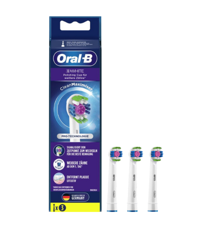 Wilt u graag een frissere, wittere glimlach zonder uw poetsroutine te veranderen? Met de Oral-B 3D-White opzetborstels met Oral-B CleanMaximiser haalt u meer uit uw dagelijkse poetsbeurt. Deze Oral-B opzetborstels zijn speciaal ontwikkeld voor het verwijderen van oppervlakkige verkleuringen. De unieke polijstcup helpt uw tanden hun natuurlijke witte tint terug te krijgen. Met deze 3 stuks Oral-B opzetstukjes kiest u voor een grondige reiniging én een zichtbaar frisser resultaat.