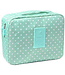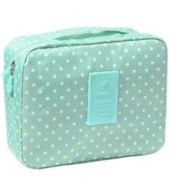 Iedereen kent dat moment waarop u net dat ene verzorgingsproduct kwijt bent. Met deze toilettas gebeurt dat veel minder snel. De vorm blijft goed staan wanneer u hem opent en de indeling helpt om uw spullen logisch te verdelen. De print met mint stippels geeft de tas iets vrolijks. U hoeft er niet eens voor op vakantie te gaan; thuis in de badkamer komt hij net zo goed van pas. Het formaat is handig zonder lomp te zijn, waardoor hij in bijna elke tas past.